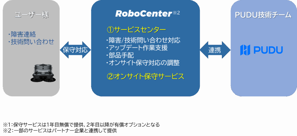 RoboCenterのサービスチームが、障害時の問い合わせ対応からアップデート作業支援、部品手配、オンサイトでの保守対応まで幅広くサポート。ユーザー様のご連絡に対して迅速に対応し、必要に応じてPUDU本社の技術チームとも連携しながら、専門的なサポートをご提供します。