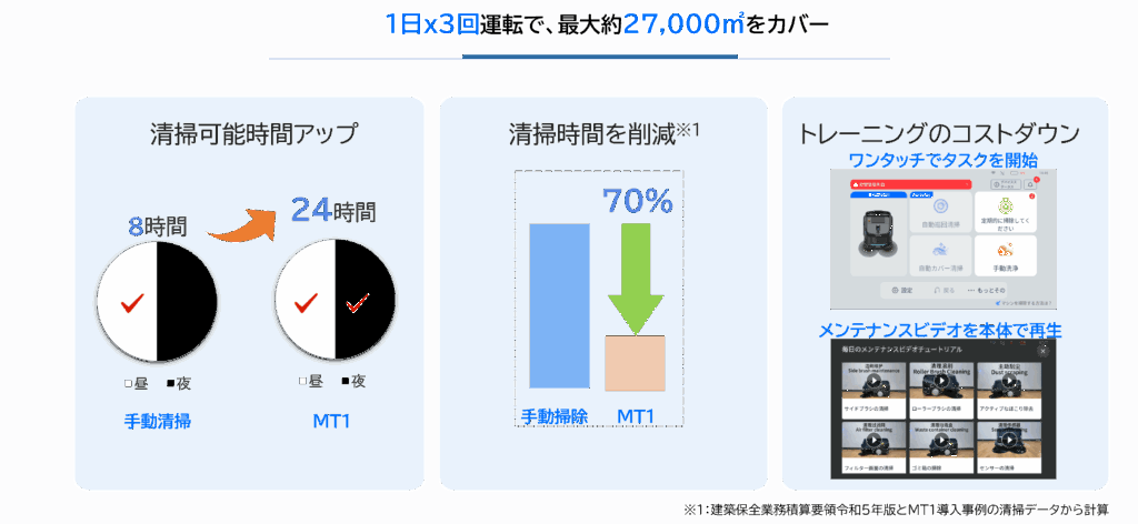 1800平米/時の清掃効率で、清掃時間を70%削減します。夜間も含めた24時間稼働により、人件費をさらに抑制します。